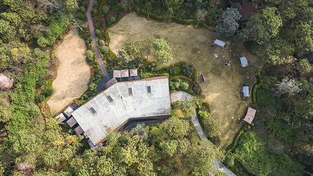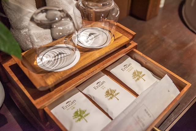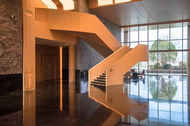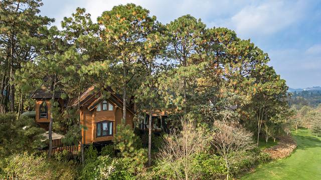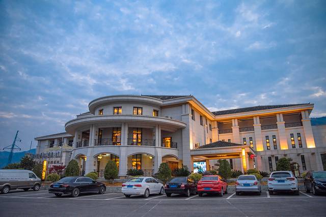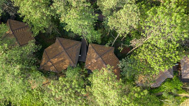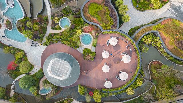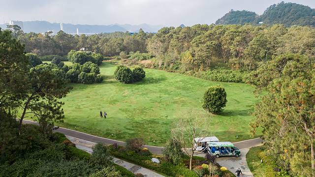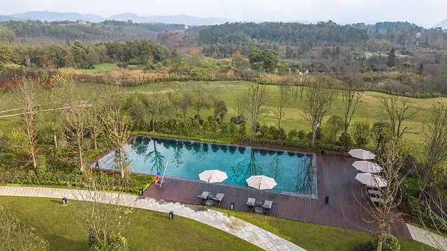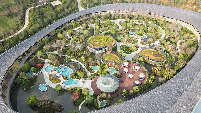 刚抵达酒店时,已是深夜,酒店森林里一片寂静。酒店景观灯,风光柔弱,接驳宾客的观光车,巡着光线,蜿蜒穿行其间,扑面而来的空气也是格外清新,透过车窗,斑斑点点的星光镶嵌在夜幕上,很是幽静。航拍视野下,方圆十几公里都是群峦叠翠,生态极好。不知道的意外是国外某处自然保护区呢。