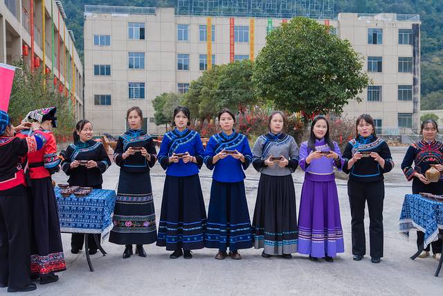 布依族人身着民族服饰,一字排开,双手端起拦路酒——当地酿制米酒,欢迎八方来客。年底刚晒制好的腊味,为香扑鼻,这就是以矛香猪为食材晒制好的腊味。所有游客进行了感恩酬谢仪式,随后手拉手围着篝火,载歌载舞,场面很为热闹。