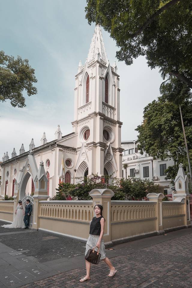 建筑是如明媚阳光的黄绿马卡龙色、耐看低调的卡其米黄莫兰迪色,道路两旁都是又高又密的老树,穿一袭白裙执一束鲜花,氛围感就很满了。