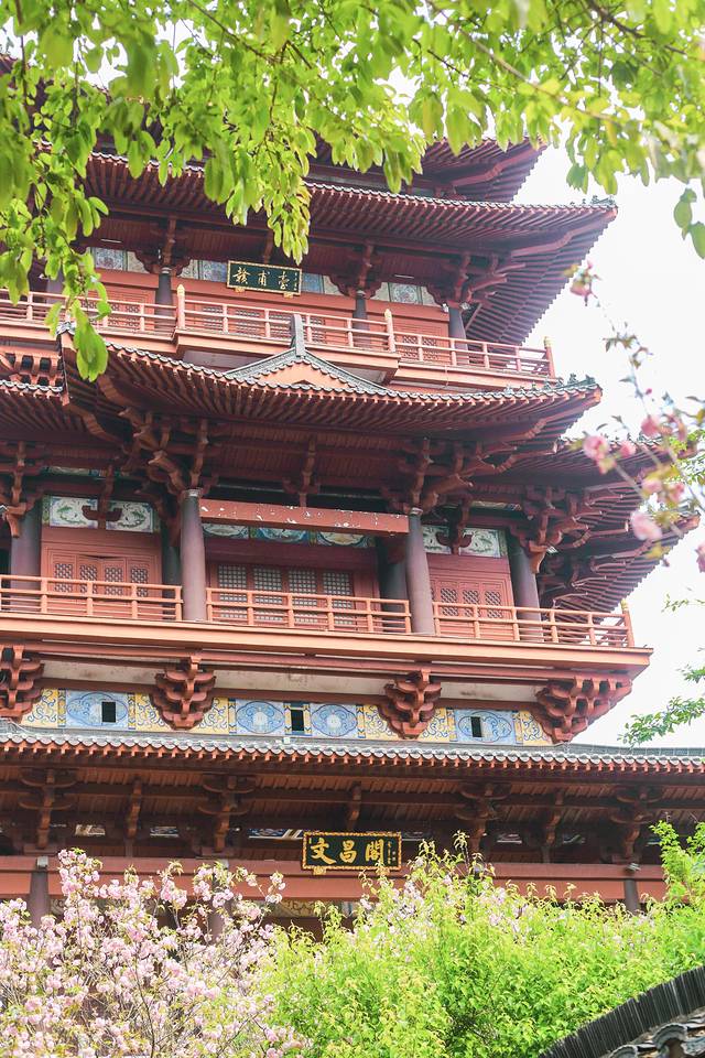 在浅粉色的樱花林中,鲜红色的文昌阁更显动人。