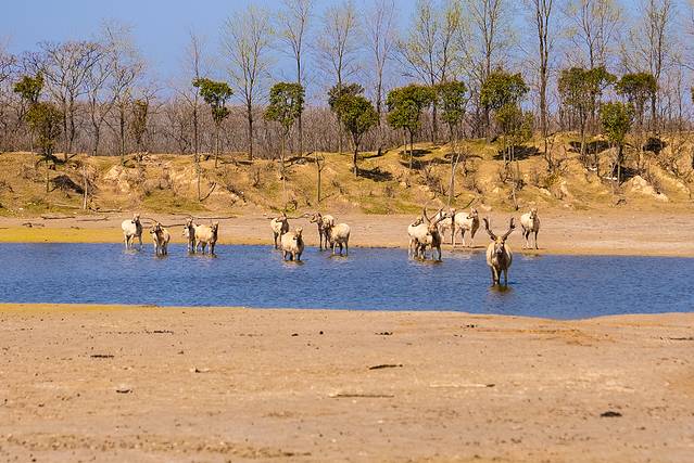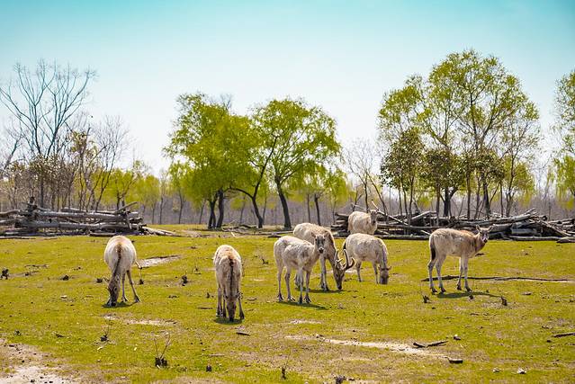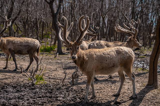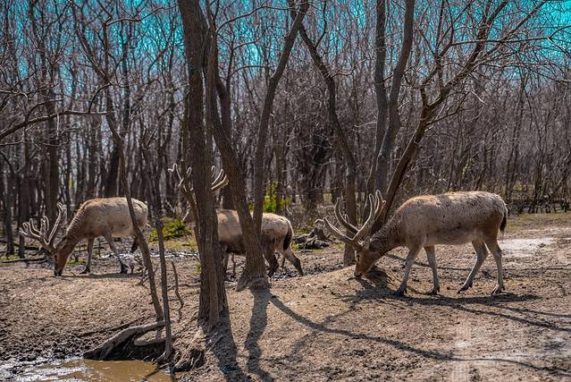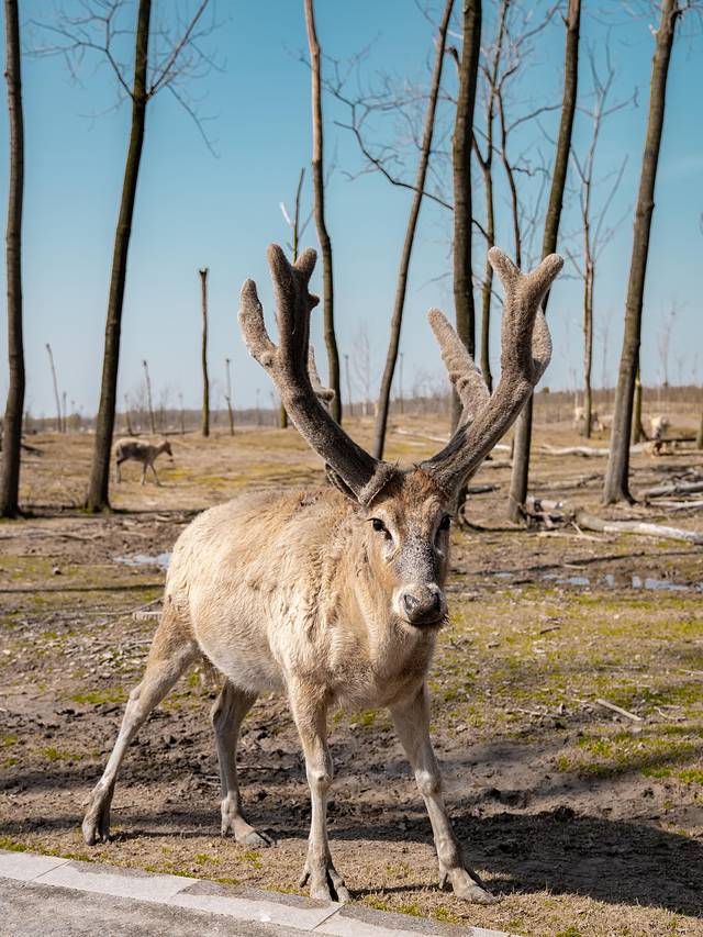 当我来到中华麋鹿园,见到这群被皇权奉为精灵有了具象化。或许一只不见,但一转弯便看见林子中成群麋鹿在休憩,此时它们头顶还是鹿茸,但不过多时鹿茸退却,磨掉后在鲜血里生出尖锐硬实的鹿角,这是它们的武器和权威。