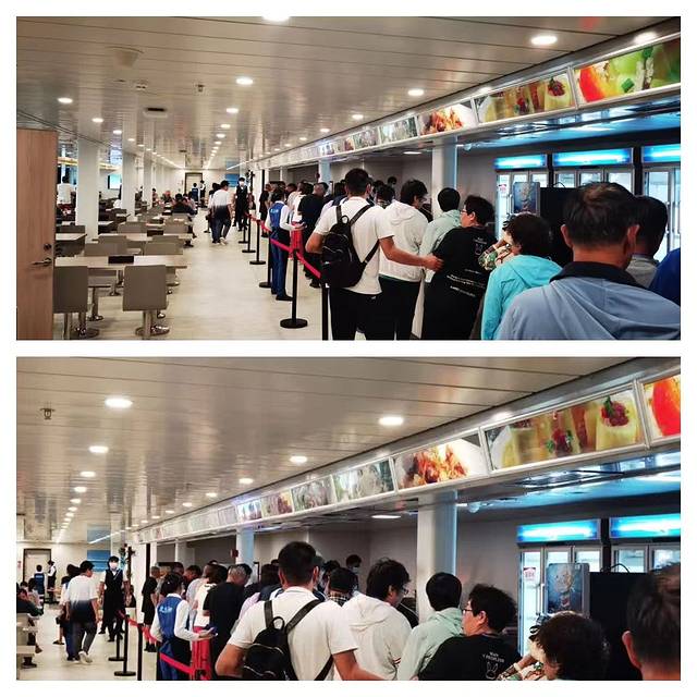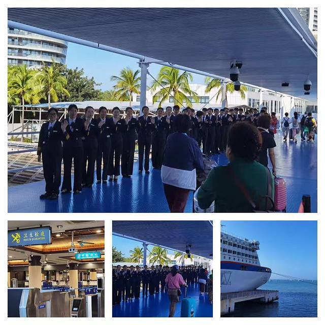 第四天上午八点多船行至在港口外,因航道拥堵,九点抵达港口。下船经过蹬船桥时,工作人员站列两行挥手致意送行。