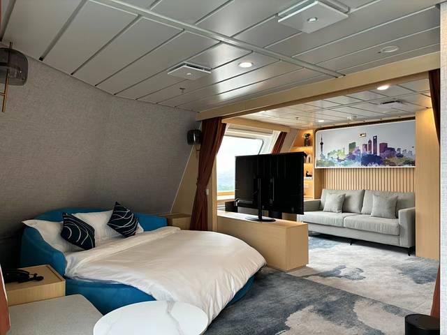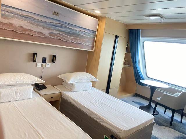 房间不大但干净整洁,所有设施都比较新。梯形的飘窗让视野更开阔。两张床上还有一个可展开的床,另加一个人费用要便宜很多。房间安顿下来后,到船上各处走走,侦察熟悉环境。