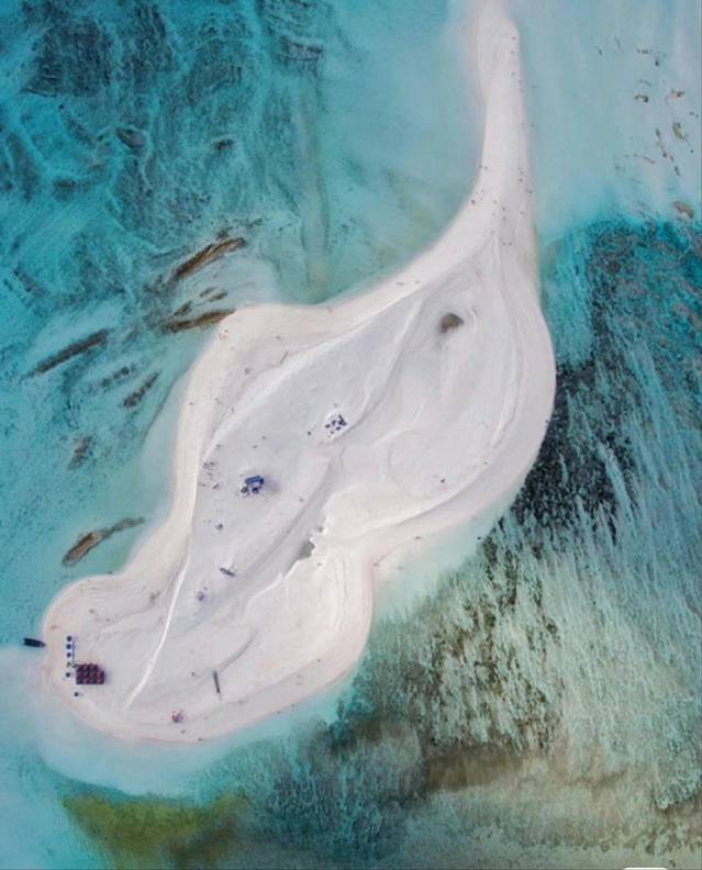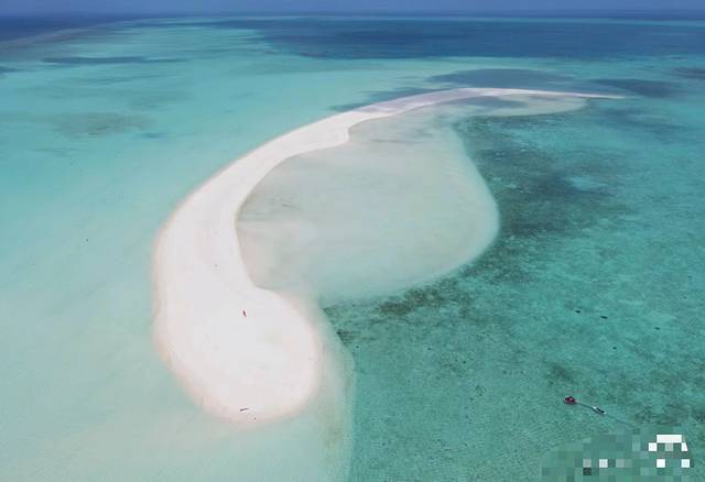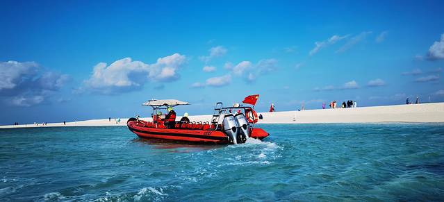 所登的第一个岛是全富岛。这是一处无人岛,因为岛区水产丰富而得名。岛上全是由珊瑚和贝壳渣构成的海沙,粗细不一,甚至还有小的珊瑚石,但材质一致,质轻色白。岛上寸草不生,无任何建设,当然也无厕所,要求登岛前解决好生理问题。四周海水清澈、透明,可凭肉眼看到海底的景象。岛上不允许游泳,不过很适合拍照。