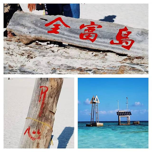 全富岛在不断变化,还在移动。随着风浪的袭扰,此岛形状是变化的。过去在岛上建的碑石现已沉浸在水中。现在在岛上横竖两块儿木牌,分别书写“全富岛”和“开心”的字样。环岛皆水也。绕岛走一周,随着时间、地点和光线不断变化,海水展现出各种各样美丽的色彩,五光十色。有深蓝、有淡青、有浅绿、有杏黄,一条条、一块块相互交错着,斑斑驳驳,层次分明,变幻莫测,令人神往。