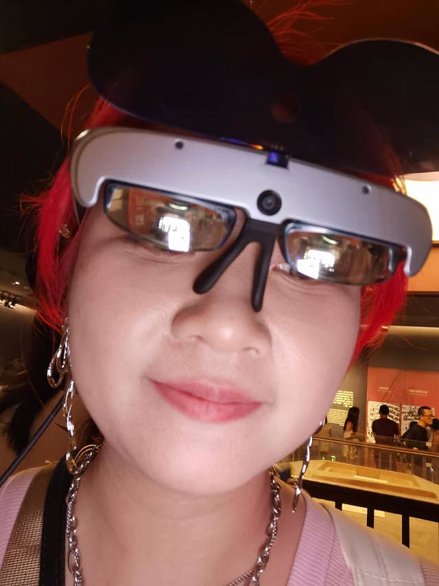 那个眼镜好重,不仅压我鼻子(我本来鼻梁就矮),还有一根电线接在耳朵后面,很卡我的脖子。以及想看清镜片的画面就要放下黑色的背景镜片,但这样又看不清楚展品。