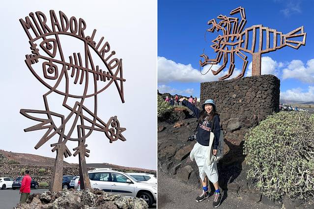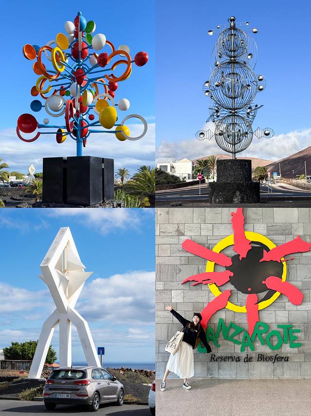 虽说岛上的基调是黑乎乎的,但当你认真看就会发现,路上有很多这种充满色彩和设计的大型艺术装置,重点是还会随风而动,甚至有一些会发出悦耳的声音。这里就不得不提到这个岛上最重要的艺术家,也是这座小岛的总设计师César Manrique,连兰岛唯一的机场都以他的名字命名(下图右下,是在机场拍到的这个岛的logo)。