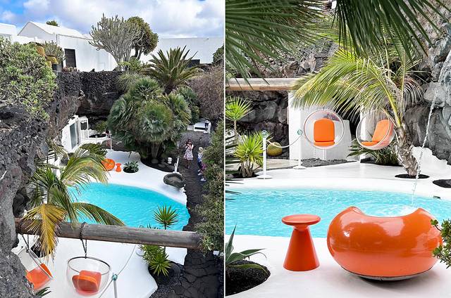 César Manrique的建筑设计作品中很喜欢用到泳池元素,而且不是纯游泳的标准竞赛泳池,所有边缘都是圆滑的、非线性的,观赏性非常强。他选了个大的火山熔浆气泡,依势掏平一块地造泳池,旁边用色彩丰富的桌椅点缀,原本黑乎乎的熔浆空间,瞬间就变得富有生命力了。他喜欢和他的朋友们相聚在泳池旁,喝喝酒聊聊天,或者进去泡着水漂浮着,想必这也是当时看来“玩得很花”但确实快乐的聚会了。