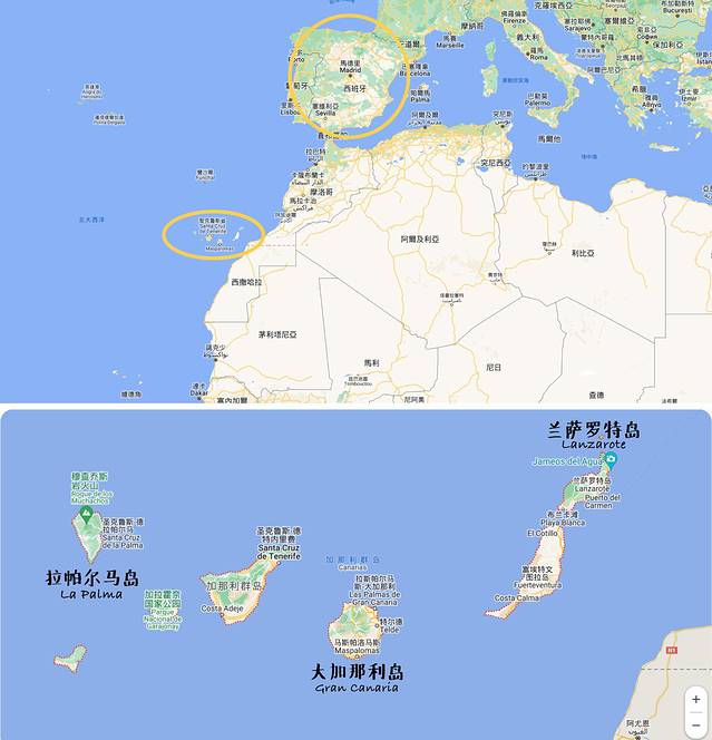 先聊聊目的地的基本概况吧。加那利群岛是西班牙的17个自治区之一,也是一个离开了半岛、甚至离开了欧亚大陆的属地。它以8个火山喷发而形成的岛屿组成群岛的形式,位于非洲大陆西北部边上。东边是撒哈拉沙漠,西边是大西洋,最近的岛屿离非洲大陆直线距离仅120公里。所以和很多海外群岛一样,虽然你来到的是西班牙领地,但实际上人已经到了非洲。因离赤道更近、属于亚热带气候,在春天的伦敦还下着冷雨、柏林还穿着羽绒服的时候,加那利群岛已经迎来了十分充沛的阳光、更长的日照时间,于是这里就成了很多欧洲老钱们后花园般的度假天堂。