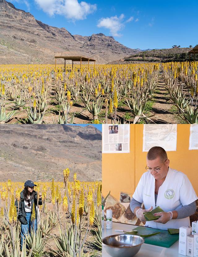 车开到半路,这里有一大片Finca Canarias的芦荟种植场(下图)。行程安排了专业人员讲解芦荟的种植生产和使用,我才知道原来这些漂亮的黄色芦荟的花可以吃,而且还很甜;而芦荟和植物龙舌兰一样可以酿酒,能酿出品质非常高的金酒和龙舌兰酒;因为岛上水资源珍贵,所以种植场里使用精准滴灌。我们尝了刚切下来的新鲜芦荟,试抹了天然芦荟制成的修护胶,想象在最干燥贫乏的土壤里、生长出最滋润最具修复力的植物,我可太爱体验“当地土特产”啦!
