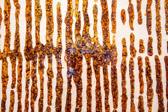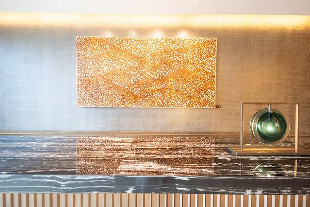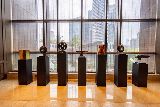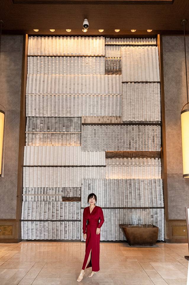 重庆兵工厂那些笨重的零部件摇身一变成为庄重的艺术摆件;夏布材质的屏风上云海沉浮,能看到重庆梯田;墙上挂着的画作更绝,这山峦叠嶂的一个一个画面,要凑近了去看,是用辣椒籽和辣椒油做的!一颗一颗小辣椒拼成山城的模样……丽晶用生活中那些质补的、司空见惯的材料用来做装饰,也可以这样优雅大气,这里没高奢酒店的盛气凌人,每个细节都拉进了人和物距离。