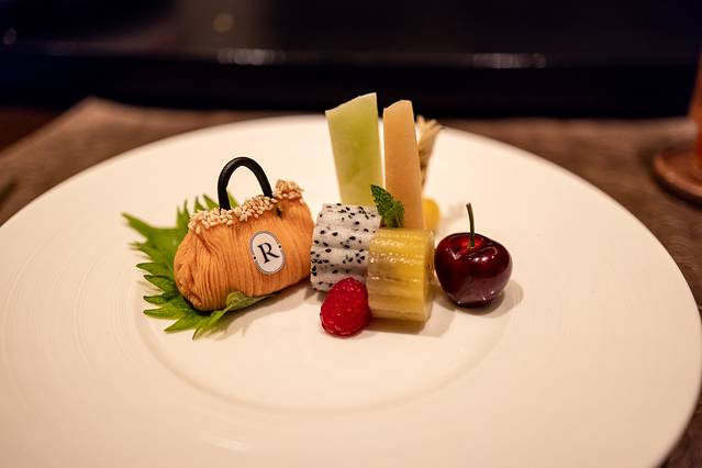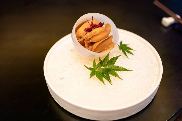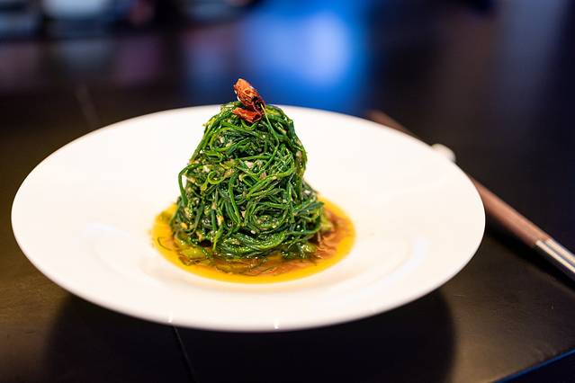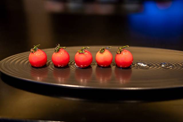 餐厅的行政主厨介绍说,餐厅是以粤菜为主,哈谁能想到这一餐是这样和川菜融合的粤菜呢!前菜冷盘就已经让一个嗜辣者拍手了!冰盏辣卤鲍鱼,这种在青岛常见的食材,在这里可以这样香辣丰富,这种入味的感受是用秘制料汁浸泡八小时制作的。 特色夫妻肺片有好吃的牛舌,炝拌头菜银软丝里面加入的是涪陵的大头菜,炖了四个小时猪耳朵软骨爽脆,看似简单却充满惊喜的凉菜; 山葵琉璃番茄,小番茄掏空后放入清酒和核桃仁,创意无限……