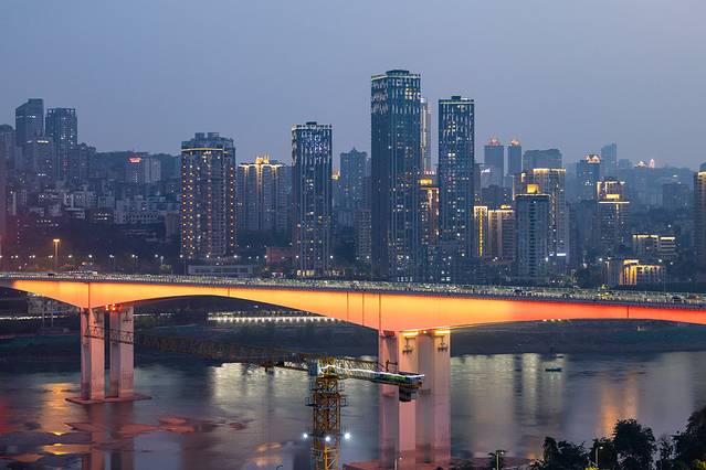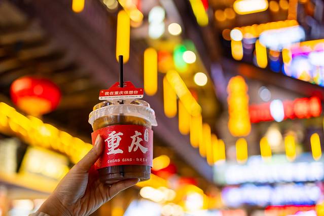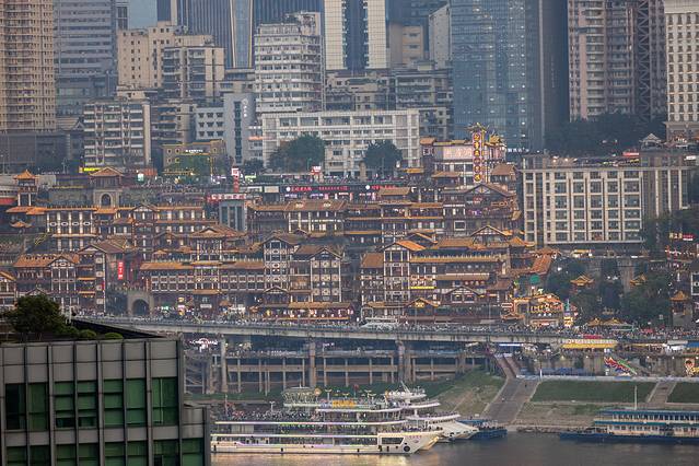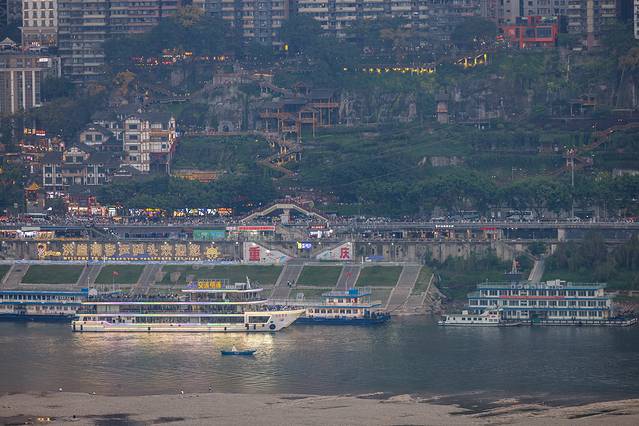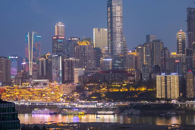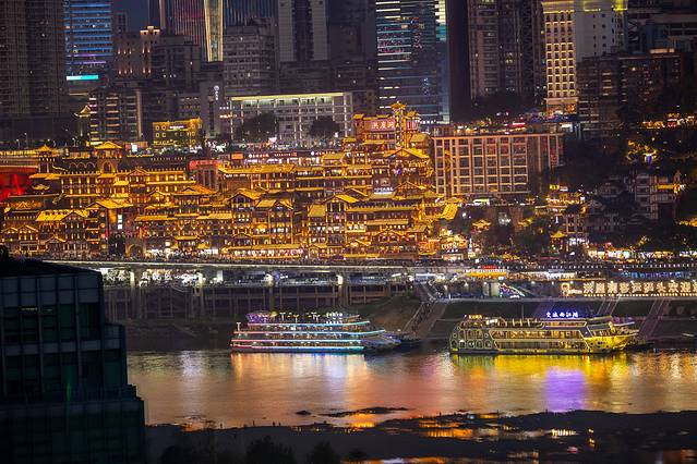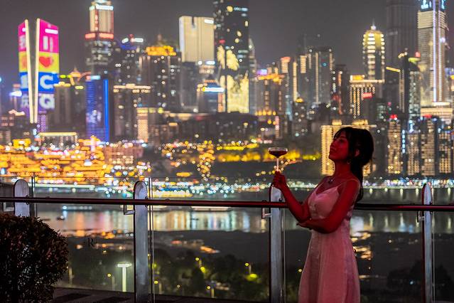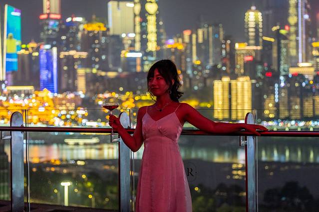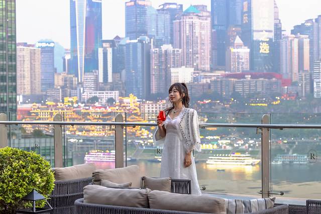 在重庆的惊艳时刻之一,是和好朋友们约在了丽晶七楼的两江吧,我们从傍晚等到天黑,看着城市亮灯,凭栏远眺渝中半岛和嘉陵江的璀璨夜景,将对岸的洪崖洞和重庆的魔幻建筑尽收眼底。微风拂面,初夏难忘的浪漫时刻。