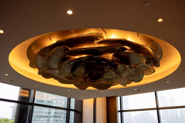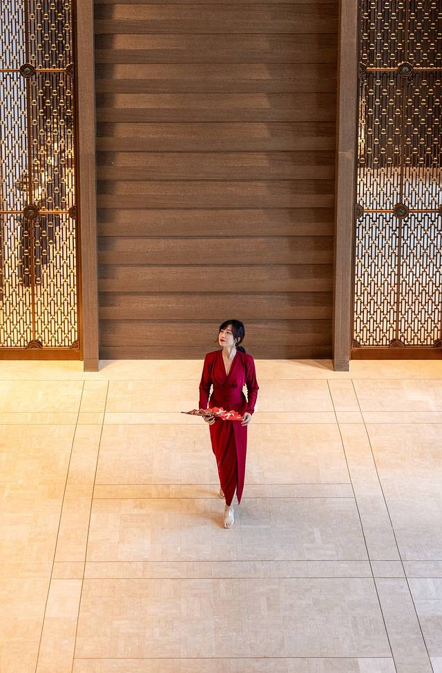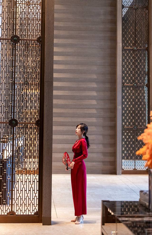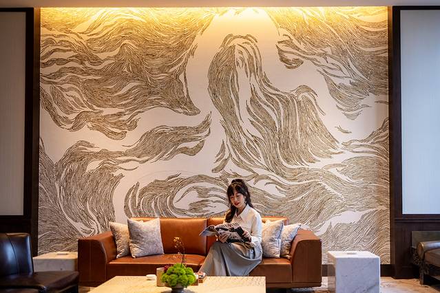 仔细看,酒店出现的金色墙面呈现斑驳样貌,古时候宫廷里会有大面积刷金,随着时间流逝变成斑驳的样子,设计师用金箔特意做出的裂纹金漆,令人有如置身帝王家的尊贵感受;白色的墙壁也不空洞,立体山茶花充满了动态美感,怒放的花朵从天而降纷纷飘落像一场梦;还有重庆人一看就会心一笑的竹席墙面,听说一入夏重庆人就早早铺上凉席,家人在凉席闲坐话家常度过漫长炎热夏夜。