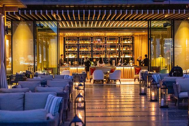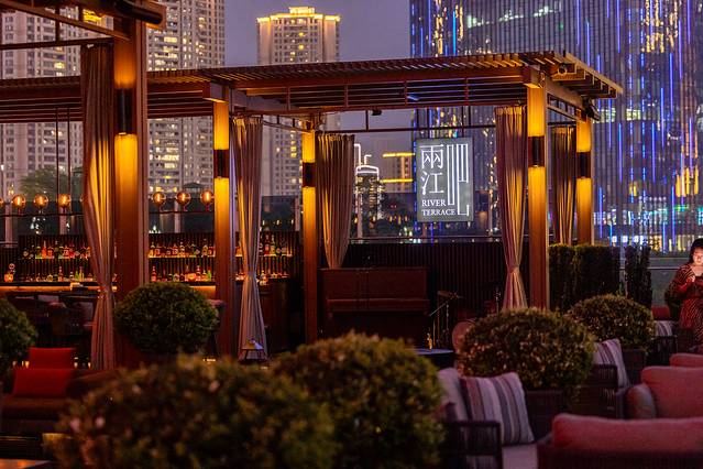 两江吧真的很美,蓝光时刻时候,一盏一盏的烛光灯被点燃,亭台楼阁的写意设计,现代又婉约,每天晚上都有现场乐队歌手的live表演,可以一直待到凌晨和城市一起入睡。