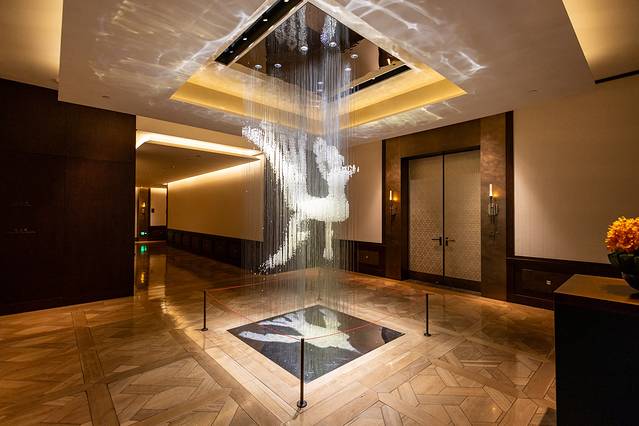 这是入住丽晶的第一餐,也是我遇见重庆美食的第一面,走出电梯,整个人被一只由25万颗水晶组成的水晶鸟型樽吸引,侧面看着像凤凰,正面背面看像酒樽,晶莹剔透的水晶,造型灵动流畅,隆重又华丽。