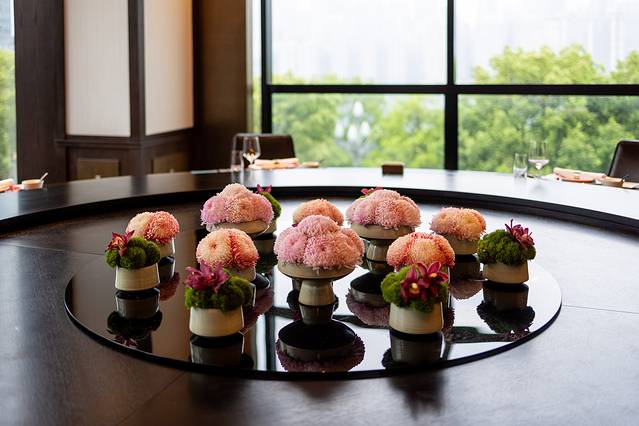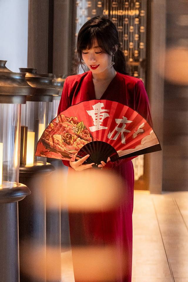 大包间的墙面用抽象的手法描绘重庆的地形地貌,仔细看能辨别渝中半岛、朝天门、嘉陵江长江两江交汇像鸳鸯锅一样。落地窗将重庆的车水马龙和无敌江景尽收眼底,大圆桌上摆放着惊艳鲜花,桌面上方是一朵巨大铜制山茶花,山茶花是重庆市花。