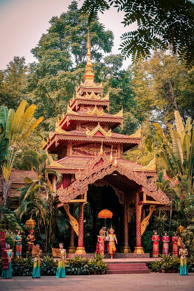 园区里面非常大,由公园、村寨、佛寺三位一体的游乐点,还有各类民俗节目演出,有身着华丽的传统服饰载歌载舞的,五彩斑斓的服饰映衬着他们的笑脸。