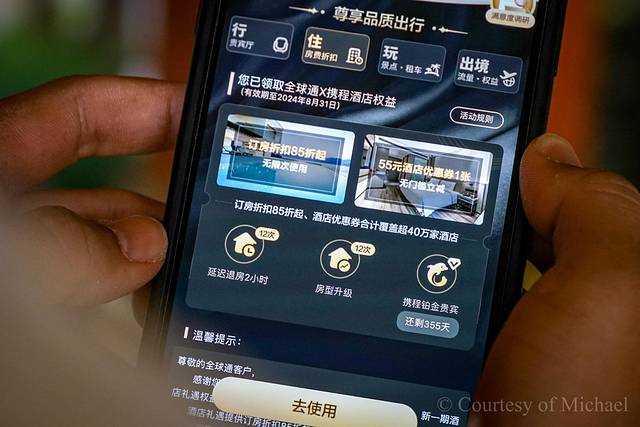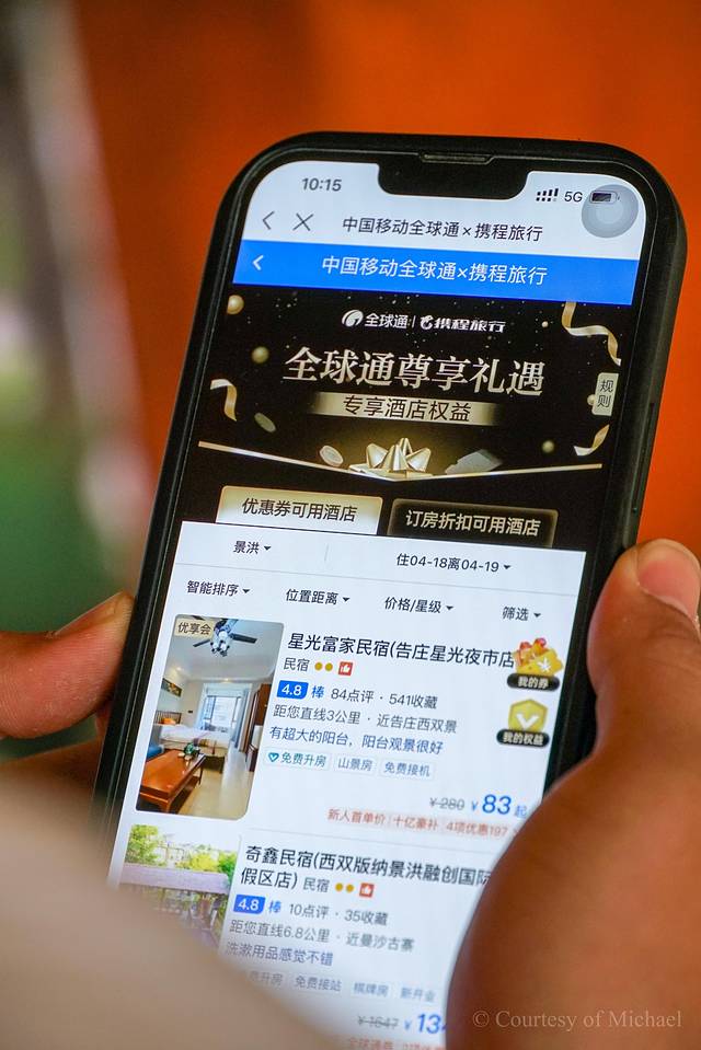 每次旅行前,我都会习惯提前做好攻略,开始订机票、订酒店,以前我习惯在各大OTA平台反复对比,虽然能找到比较有优势的选择,但缺点是要付出大量的时间成本,比价过程来回切换后台也很麻烦。但这次我用了“旅游搭子”中国移动全球通APP,作为白金卡会员的我尊享了很多出行礼遇,发现在上面订房直接能享受85折起的优惠,还有延迟退房、房型升级等权益,这不仅大大节省了我出行前做准备工作的时间,在旅途中也不用着急忙慌地赶在中午前收拾行李退房了,对于经常住酒店的我来说简直太友好了。