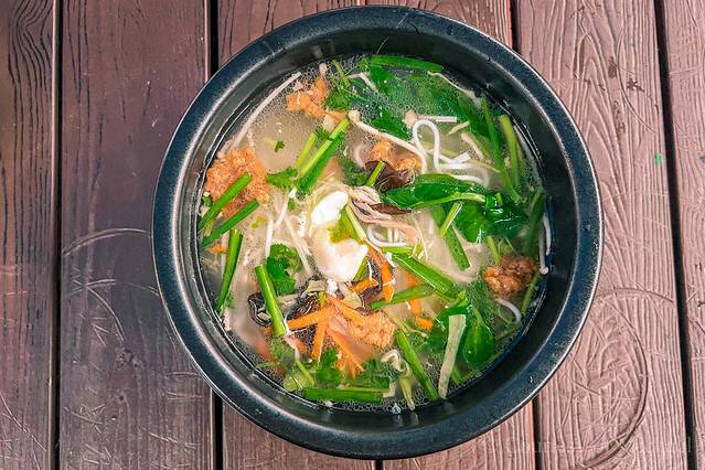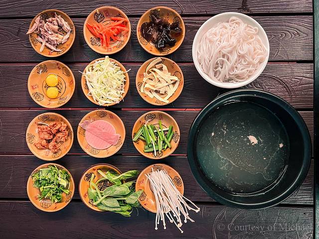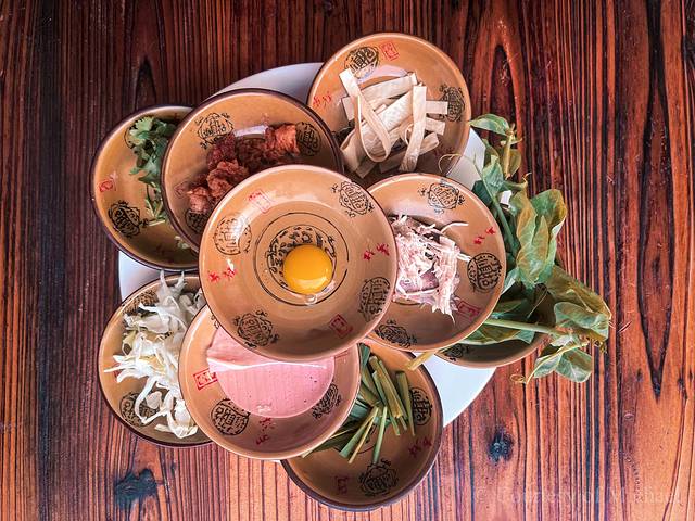 (6)过桥米线:最纯正的吃法,自己动手把每样配菜加进热腾腾的鸡汤里,清澈透亮,香浓无比的鸡汤,外加蔬菜的清香;吃前先喝口汤,肉片极嫩,汤极鲜,真的太满足了。