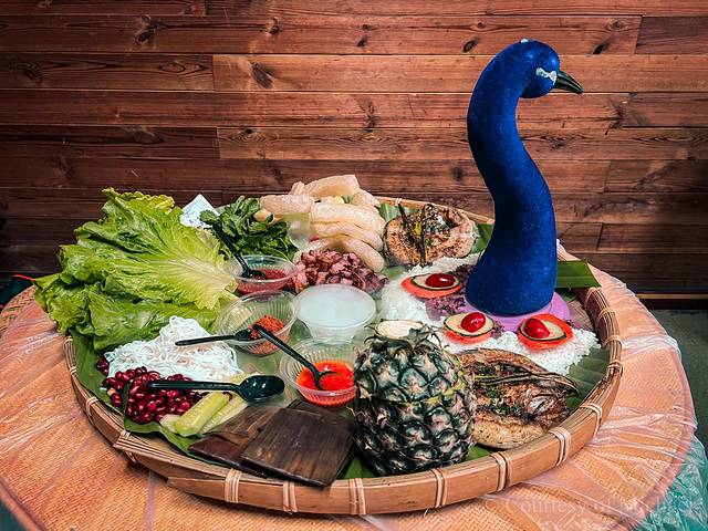(2)手抓饭:在一个大的芭蕉叶上摆放着各种美食,有水果、肉和鱼等,也有糯米饭等,形式有趣,味道可口。