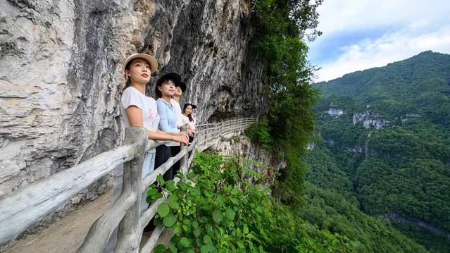 飞云栈道上山景壮观,往下看还能看到著名的太极天坑,它的宏伟与震撼再次将这次登山徒步主题升华了。