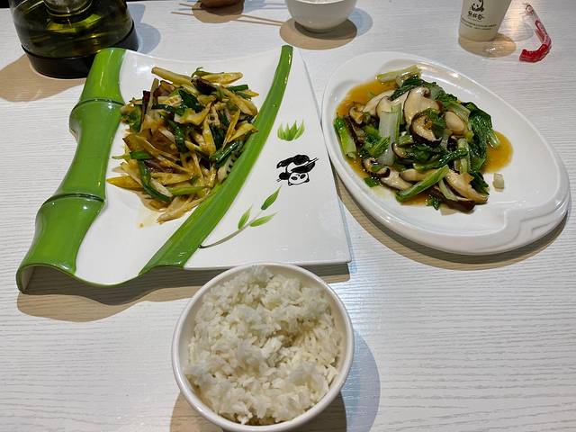 酒店在景区里 周围环境很好 一个两人标间的房费包含了一张午餐/晚餐券、两张早餐券和两张熊猫谷景区的门票 酒店内外整体设施都装饰的很有特色 到处都有熊猫的元素 晚餐吃了当地特色竹笋炒腊肉 味道不错 酒店旁边有休闲娱乐设施 秋千 篝火什么的 可以转一转 散散步 回房间后洗漱 看了会儿电视就早早休息了 因为第二天准备早起去看熊猫🐼