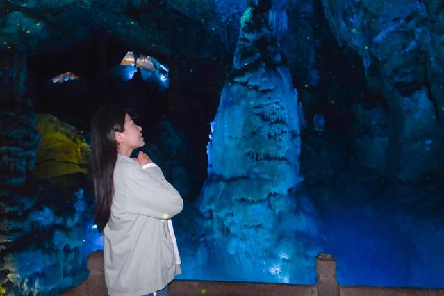 三洞厅的“三十三重天”,石笋漫天,层层叠叠,颇有彩霞东升,瑞气氤氲之感;“瑶琳玉峰”仿佛一座孤傲的女神,它亭亭玉立,独自傲立在洞内,是瑶琳仙境的瑰宝。当我们正为这位女神陶醉之时,一旁的溶洞飘雪已然开启,我们一下从远古穿越回现代,雪人、圣诞树布置其间,当“雪花”纷纷落下,我们兴奋的在这里跳舞、旋转、拍照,伴着周杰伦的音乐,氛围感拉满,超级浪漫。