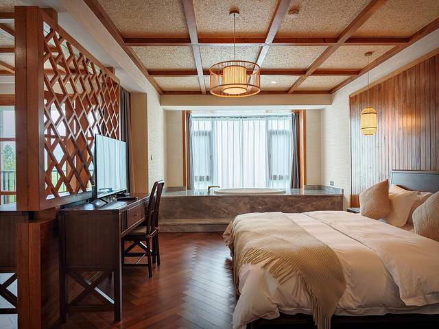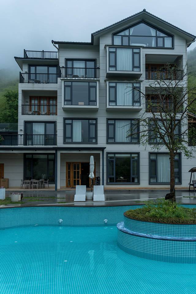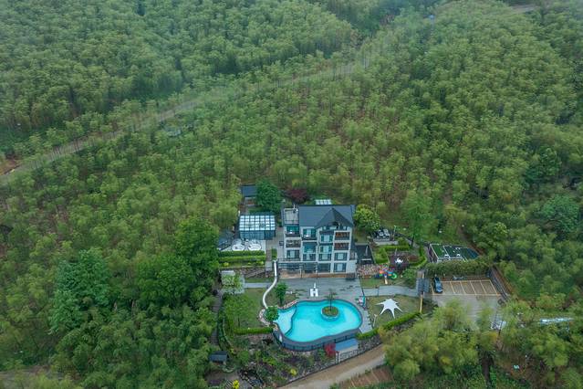 公区有很多很好完好的设施,无边泳池,户外草坪,餐厅,可以观赏露营,体验下露天浴缸,可以看到竹林美景。