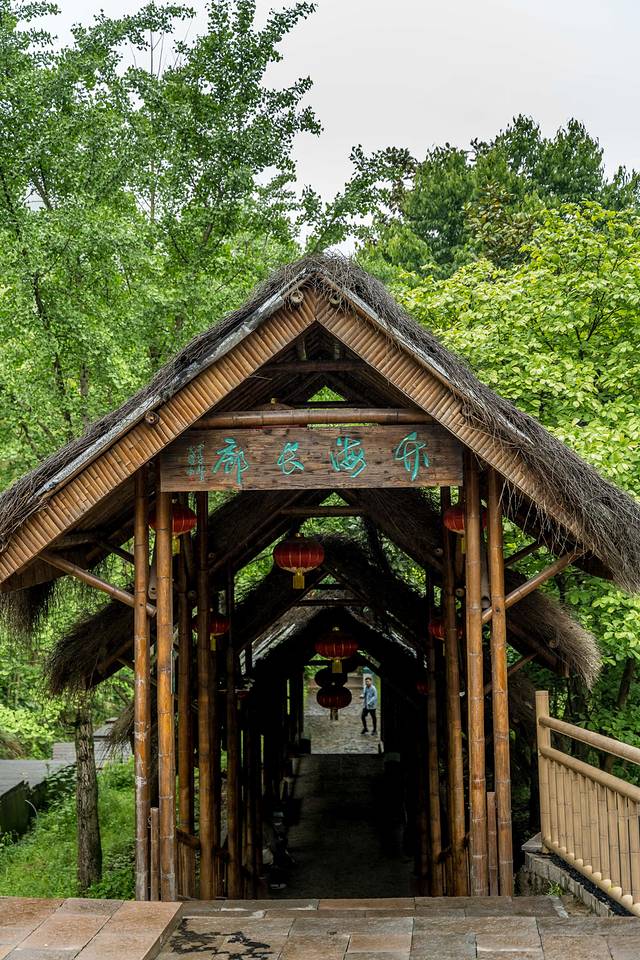 竹海长廊。景区入口附近一处供游人小憩的地方,也是林场工作的村民劳作之余避雨和休息场所。