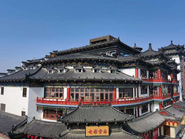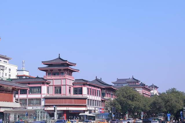 大悦城3号门前,红墙、绿树和大雁塔,相映生辉,层层叠叠