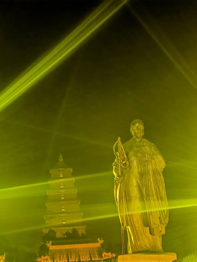 喷泉表演结束后,可以向大雁塔方向前进,来到诗词街。走大约十分钟在下一个路口右转,看到玄奘雕像,然后过马路。