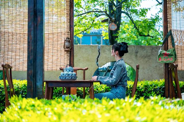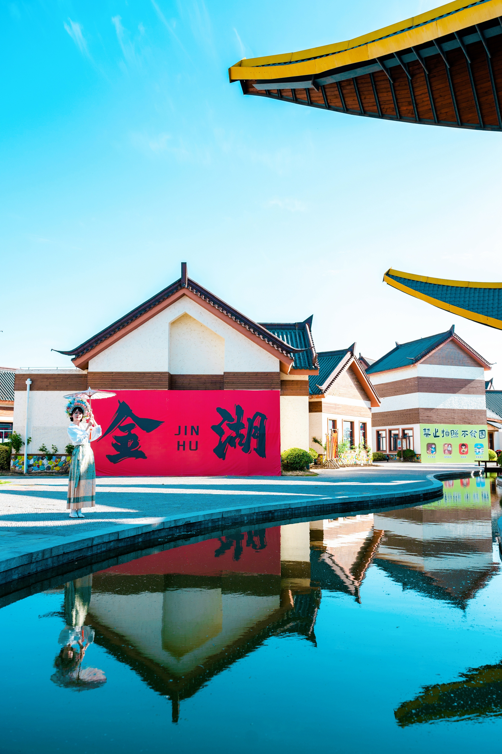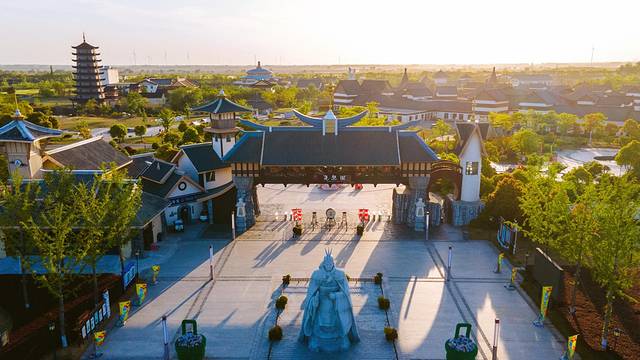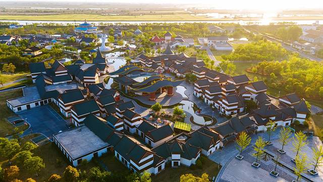 空中俯瞰尧想国,仅仅是一眼,就足以给人一种穿越到了神话世界中的感觉,青绿色的屋顶,金黄色的檐角,朱红色的立柱……这些元素融合在一起,再加之一位身穿古装的女子,随手一拍,就是一张绝美大片。