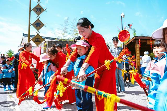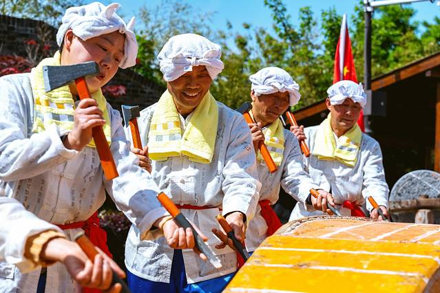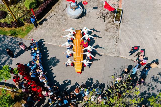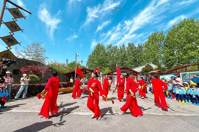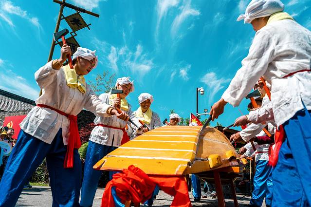 刚到黄庄游客中心前的广场上时,早已聚集了许多人,此时精彩纷呈的民俗表演正在进行。《打排斧》是修造木船时举行的一种生产劳动仪式,也是由运河民俗生活中演化而来的艺术,后逐渐成了一种敲打音乐,斧头敲击在船身上,“咚咚”的声音既富有娱乐性,又富有艺术性。