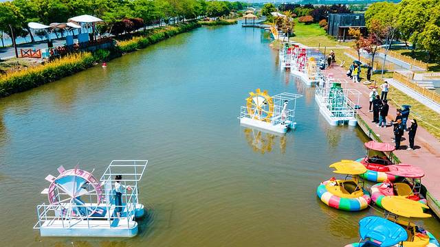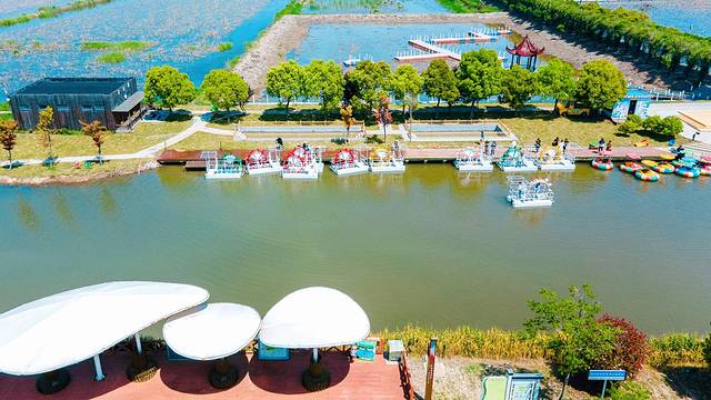 荷花荡是国家4A级旅游景区,从名字也可看出,这是一处以荷花为主元素的景区,拥有荷花仙子广场、碧荷亭、观荷园、紫藤长廊、百荷园、水漾年华、荷文化体验馆等景点。这个季节的荷花荡,虽然没有“接天莲叶无穷碧,映日荷花别样红”的景色(荷花每年6-9月份盛开),但也有许多好玩的体验项目,比如钓小龙虾、下水摸鱼、水上碰碰船等。