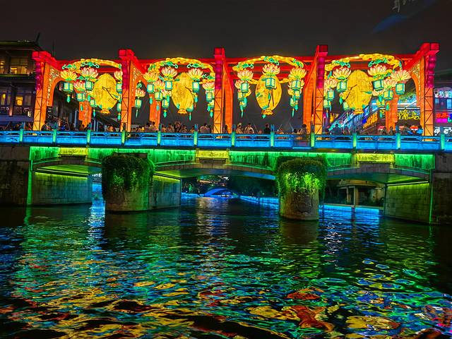 文德桥上热闹非凡,游船启航,金陵数百年的繁华沉淀,在绚丽多彩的灯光秀中演绎。