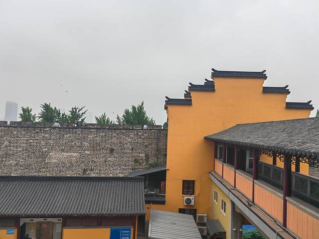 还未出鸡鸣寺就能看到城墙。鸡鸣寺毗邻南京城墙台城段,从鸡鸣寺出来之后,直行走过解放门,即可看到城墙登城口。