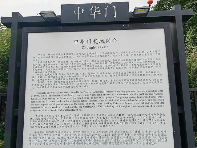明代初年,建造聚宝门时,朝廷为保证城墙砖的质量,采取了严密的检验制度,每块砖上都在侧面印有制砖工匠和监造官员的姓名,一旦发现不合格制品,立即追究责任,城墙历600多年风雨依然固若金汤。中华门在世界城垣建筑史上占有重要地位,也是世界上保存最完好、结构最复杂、规模最大的堡垒瓮城,有“天下第一瓮城”之称。