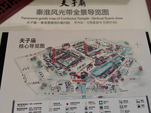 夫子庙依着秦淮河,秦淮河成了孔庙的标配——泮池,池子的南岸一面长达百米的赭红色大照壁上金龙飞舞,照壁建于明朝万历三年(1575年)。坐船夜游分东线西线,此处码头是西线,乌泱泱的人排队等候上船。