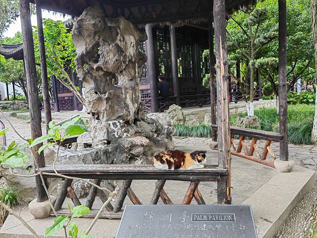 棕榈亭。具有广西风情的木亭,顶部用广西产棕榈叶覆盖。1853年太平天国定都天京,将士中以广西人居多。花猫盘踞于此打瞌睡,已经习惯被游人撸,它就是不想走。