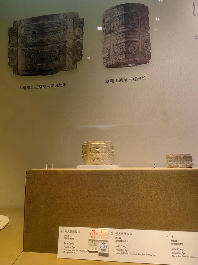 神人兽面纹玉琮,良渚时期。出土于常州市武进寺墩遗址 4 号墓。此玉器是良渚文化琢玉工艺的代表作品。上节是人面纹,下节是兽面纹,为良渚文化宗教信仰核心。良渚文化是个大概念呢。