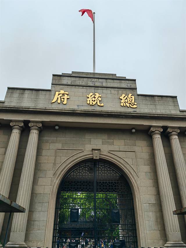 总统府门楼。原址为清两江总督署辕门。太平天国时期为天朝宫殿“真神荣光门”(又称“皇天门”或“凤门”)。国民政府成立后,于1929年12月拆除两江总督署辕门后新建了这座门楼。南京总统府至今已有600多年的历史,可追溯到明初的归德侯府和汉王府;清代被辟为江宁织造署、两江总督署等,康熙、乾隆南巡均以此为行宫;太平天国定都天京后,在此兴建规模宏大的天王府;1912年1月1日,孙中山在此宣誓就职中华民国临时大总统,辟为大总统府,后为南京国民政府总统府。
