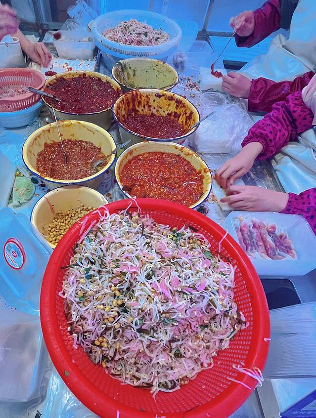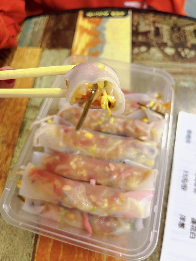 PS:外层是极薄的米皮,内陷是豆芽+豆皮+海带+炸黄豆,再搭配上5种特制酱料