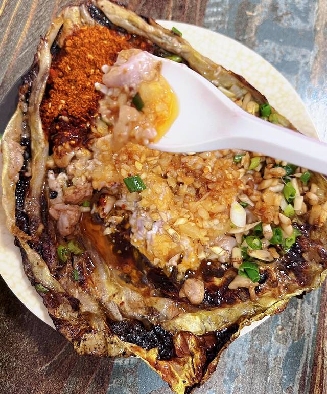 PS:鲜嫩的脑花被裹在莲花白(圆白菜)里烤