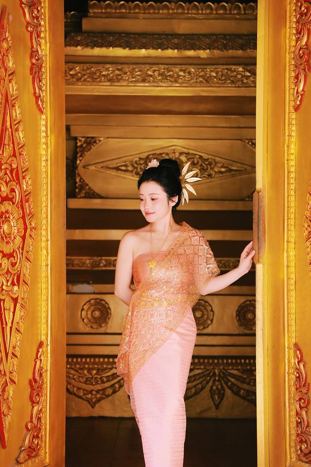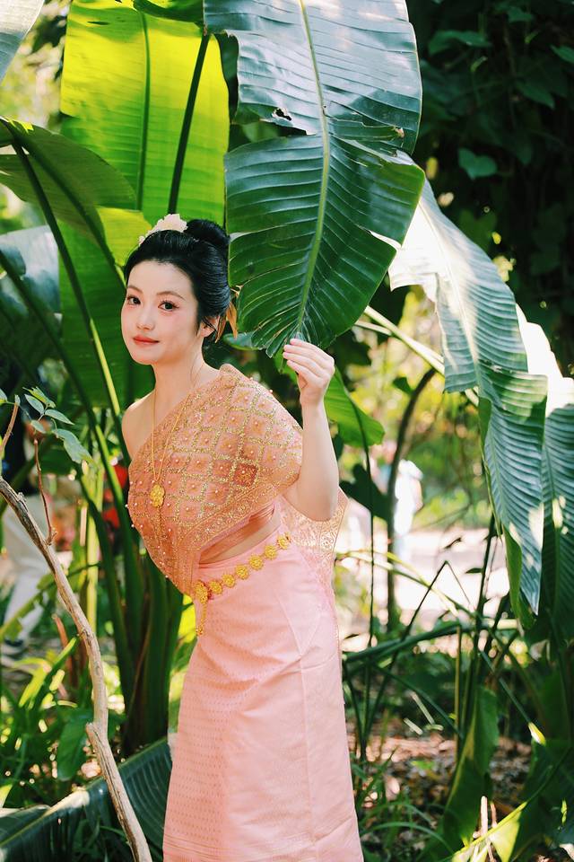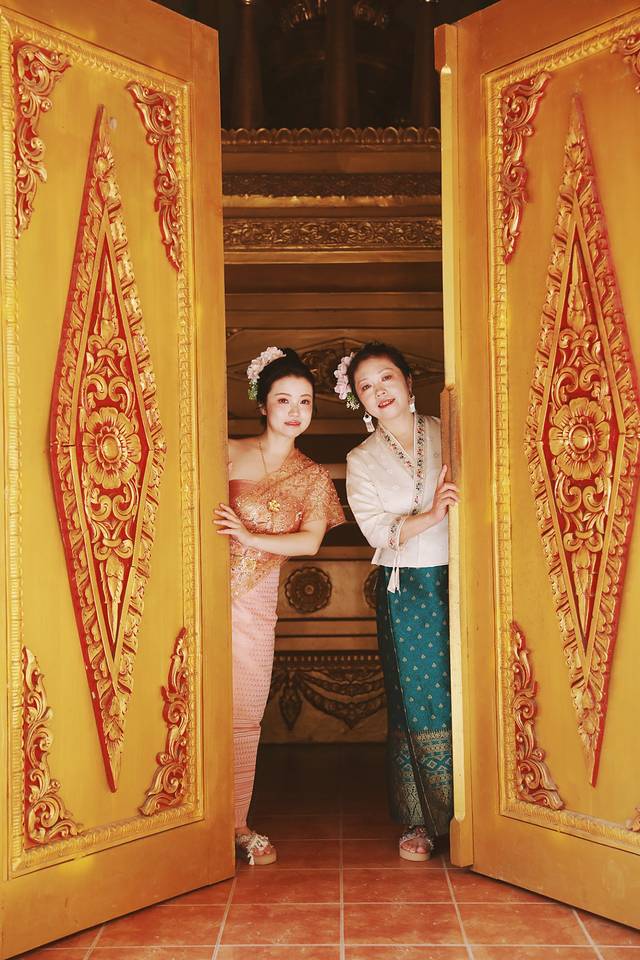 早上在妆造店化好妆后,换上在江边夜市买到的傣服,我穿的是无袖的粉色,妈妈则选择了一套中袖的傣服。