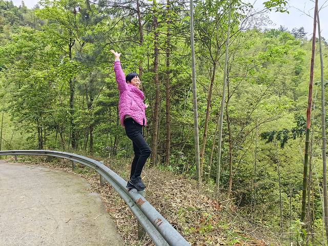 在公路围栏上,练习一个瑜伽动作。姐已不再是当年的姐了,桩子不稳了。