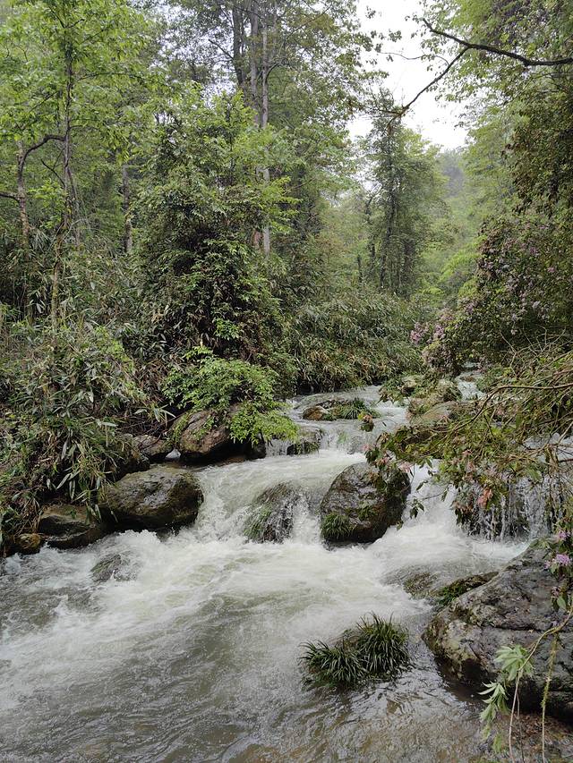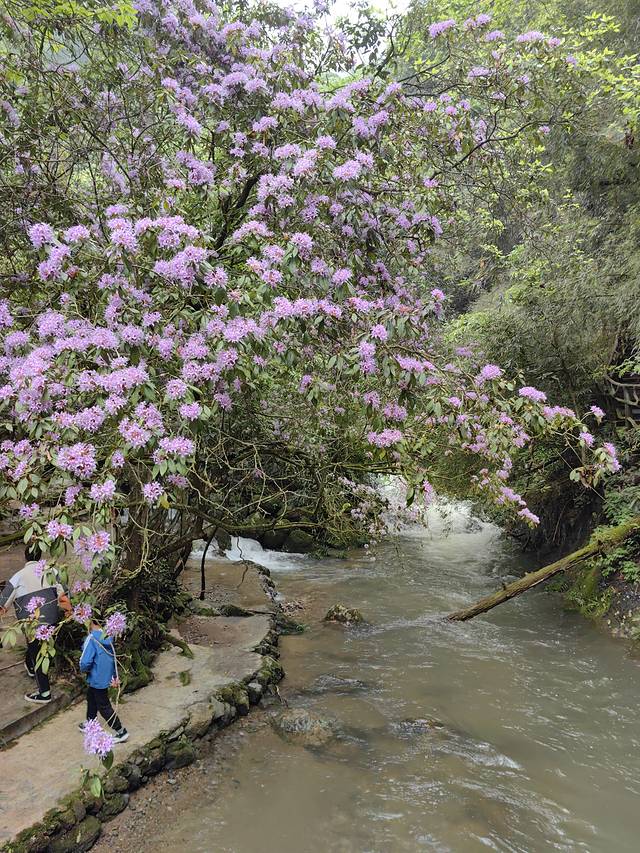 泥潭村的溪水两边是溪畔杜鹃花开得正艳。溪畔杜鹃又名贵州杜鹃