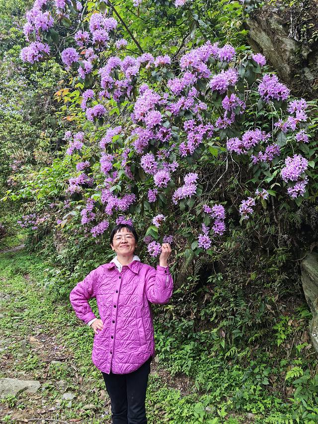在溪畔杜鹃花下,我也拍个照!