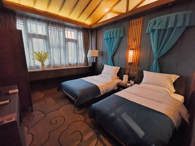 从客栈大堂一直往里走,推门而进就是宽敞而明亮的客房,配搭别致的家居设计,让人更加住的舒心;听管家说这里的家居,无论是室内室外还是小件大件,都是红木定制,新中式禅意风格的装修,搭配。