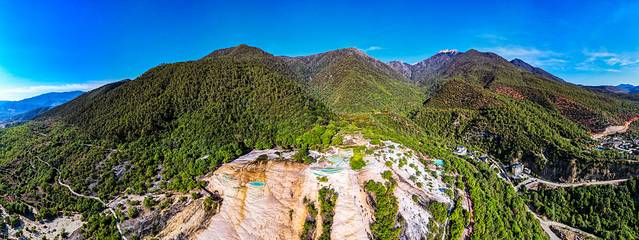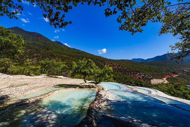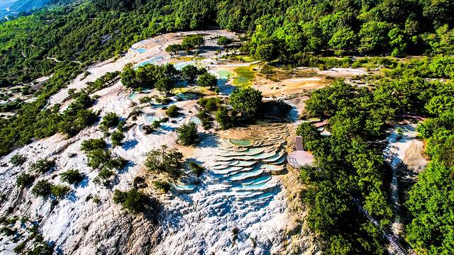 白水台其实是由于碳酸钙溶解于泉水中而形成的自然奇观。含碳酸钙的泉水慢慢下流,碳酸钙逐渐沉淀,长年累月就形成台幔,这里的泉水清澈见底,台幔如同白色的绸带般层层叠叠,好似层层梯田,美轮美奂。也如同一颗璀璨的明珠,静静地镶嵌在大地之上。